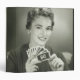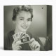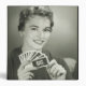 Femme de sourire tenant des cartes de jeu dans le studio, (B&W), marques de portrait | George | AssetID : 57520357