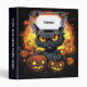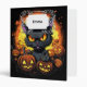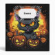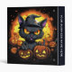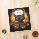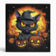 Un chat sorcier de dessin animé fantaisiste, orné d'un sourire charmant, portant le casquette d'une sorcière, perché au-dessus de citrouilles malicieux.