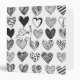 Chatte jouant tendu sur un ballon en forme de coeur entouré de différents coeurs à motifs en noir et blanc.