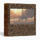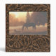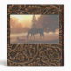 Une jument et son poulain sont enveloppés dans le brouillard matinal. Le soleil se lève avec peu de chaleur.