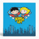 Regardez Chibi Superman et Chibi Supergirl voler à travers les nuages avec un starburst, un bouclier mi-teint derrière eux et les mots "Power Up!".