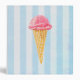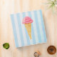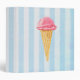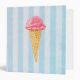 Un délicieux classeur à cône de crème glacée, avec une boule de crème glacée aux fraises roses tenue par un cône gaufre. Sur un arrière - plan à rayures bleues.