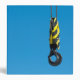 Crane hook with yellow and black stripes hanging, blue sky in background
