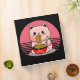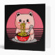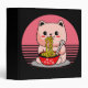 Illustration colorée d'un chaton kawaii rose mignon mangeant du ramen d'un bol rouge sur un arrière - plan rayé de soleil rose