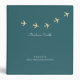 An elegant and minimalist binder to collect and organize your travel subjects... with script name and small sepia gold airplanes flying... printed on a dark blue (teal) background...
