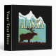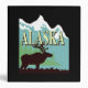 Silhouette d'un orignal, une montagne bleue et blanche et le mot "Alaska" sur le fond noir. Texte personnalisable sur l'épine
