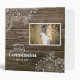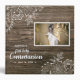 Illustration de la Première Sainte Communion moderne avec un arrière - plan en bois rustique avec des fleurs de dentelle décorative et des feuilles, script de calligraphie de typographie moderne. Il est facile de modifier l'image de l'échantillon du communicant avec votre propre image pour personnaliser le produit.
