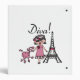 T-shirts de diva, combinaisons, tasses, sacs, cartes, autocollants, porte - clés, coussins, horloges murales, et beaucoup plus avec une conception mignonne de diva comportant une fille d'une chevelure noire dans un casquette et une robe rose avec son caniche rose près de Tour Eiffel !