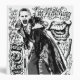 Découvrez Joker penché en avant riant, entouré d'icônes et de phrases de style tatouage.