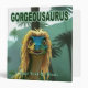 Un joli raptor dinosaure, Gorgeousaurus moteki (le beau lézard de Motek), aux cheveux longs, bouclés, blonds, dans une forêt verte de l'époque des dinosaures. Le texte "GORGEOUSAURUS" apparaît également. Customisez en ajoutant votre propre texte à la fois sur l'avant et sur la colonne vertébrale. Vous pouvez modifier la police, la couleur du texte et la taille du point.