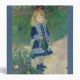A Girl with a Watering Can by Pierre-Auguste Renoir, oil on canvas 1876, est un portrait d'une petite fille aux yeux bleus, aux cheveux blonds fraise, à la robe bleu foncé à la dentelle blanche délicate et aux grands boutons ronds, tenant un petit arrosoir sur un chemin dans un jardin fleuri coloré. On dit que le sujet est Mademoiselle Leclere, et a été peint dans le célèbre jardin de Monet à Argenteuil, Giverny. Le bleu ultra-saturé de la robe et des yeux de la petite fille est un contraste foncé avec le blanc, le vert et le rose vif, rapidement peint, des fleurs et de l'herbe environnantes, complété par le rouge brillant de son ruban capillaire. Rapidement et tendrement peint en touches lumineuses de peinture à l'huile vive, le tableau évoque une image tendre de l'enfance et se présente comme une remarquable réalisation de l'école impressionniste de peinture et ses préoccupations de lumière, de couleur et d'atmosphère. Pierre-Auguste Renoir (1841 - 1919) est un peintre français et figure de proue du mouvement impressionniste français du XIXe siècle. Enfant, Renoir peint des dessins sur la porcelaine fine et les fans, et étudie les peintures au Louvre, jusqu'à ce qu'il aille étudier l'art avec Charles Gleyre à Paris, où il rencontre Monet, Sisley et d'autres membres du groupe impressionniste. Influencé par le réalisme du Courbet et le sens peint de la lumière et de la couleur de Monet et d’autres peintres en plein air, Renoir a développé un style doucement peint de lumière vive et de couleur saturée. Renoir peignit de nombreux portraits et paysages mais se concentra sur des scènes éblouissantes de la vie contemporaine qui capturèrent un instantané dans le temps, tandis que l'influence des peintres Titiens, Rubens et Rococo inspirait ses nombreux tableaux figuratifs et scènes domestiques. Renoir s'est marié et a eu trois enfants qui sont devenus des artistes accomplis eux-mêmes, et dans son âge plus âgé continuait à peindre abondamment, tout en étant partiellement handicapé par l'arthrite sévère. En 1919, Renoir devient presque le seul artiste vivant honoré par une exposition au Louvre, aux côtés des oeuvres des anciens maîtres. La technique fluide et magistrale de Renoir, le sens unique de la lumière et de la couleur, la sensualité chaleureuse et l'empathie humaine en firent l'un des peintres les plus appréciés et les plus populaires de tous les temps.