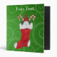 Ce classeur à trois anneaux a un gnome portant un casquette pointu rouge foncé dans un bas de Noël rouge avec des feuilles saints et deux sucres de canne sur un arrière - plan vert avec des tourbillons. Customisez votre texte sur le devant avec les modèles.