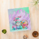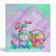 Bunny Gnome de Pâques aux oreilles de lapin rose assis dans des fleurs de printemps avec des oeufs décorés et un panier d'osier de carottes posé sur un arrière - plan de plaid turquoise et violet avec gouttes de glaçage de bonbons pastel.