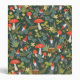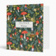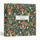 Illustration personnalisée sur le thème du bois vert et rouge, dessinée par Shelby Allison, avec un petit personnage de gnome, des champignons, des fleurs et du feuillage.