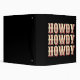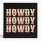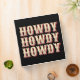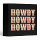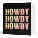 Style rétro cowboy "Howdy Howdy Howdy" design de texte avec des lettres rayées dans les couleurs jaune, rouge et beige