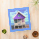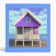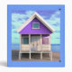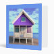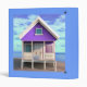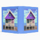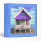 3 anneau classeur dans une mignonne petite cabane de plage / maison de vacances sur pilotis, peint blanc et violet, sur le sable, avec un ciel bleu et des nuages blancs