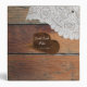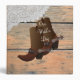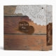 Boiseries marron faux et dentelle qui s'étend de l'avant à l'arrière comme l'arrière - plan. Deux bottes de cowboy marron avec des éperons sur le devant avec le texte "Notre Mariage"*. Un casquette de cowboy brun sur le dos avec le texte "Sweet Sunset Rides"*. *Texte personnalisable avec modèles à droite. La colonne vertébrale a un look marron de cuir usé avec du texte aussi.