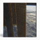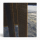 Panneaux solaires de la Station Spatiale Internationale recouverts par une Terre bleue et blanche.