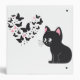 Chat noir mignon et papillons savourant une journée dans le timbre de fleurs.