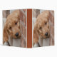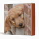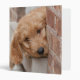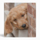 An adorable eleven week old goldendoodle with bright es curiously peeks out from a doorway in a brick wall