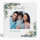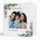 Personnalisez et ajoutez votre propre photo de famille à l'intérieur d'un cadre en arche. Décoré de verdure d'eucalyptus et de feuillage doré faux. Fond blanc élégant. Ajoutez le nom de votre famille.
