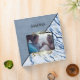 Elégante tranche triangle en marbre bleu sur arrière - plan en faux cuir bleu clair. Modèles photo et texte créés pour vous. Modèle photo sur le devant avec deux beaux porte-photos à défilement doré en haut et en bas de la photo.