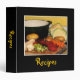 Ce classeur de recette est décoré des qualités d'un potage aux légumes fin. Les carottes, les betteraves, les choux, les pommes de terre, les oignons, l'ail et le céleri sont coupés et préparent pour le pot. Le texte noir d'arrière - plan et d'or remplissent une conception gaie et intime de cuisine. Le texte est personnalisable pour répondre à vos besoins.
