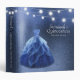 Elégante et belle robe princesse Quinceanera pour les photos de la fille d'anniversaire. Feux à cordes blanches au-dessus sur un bleu foncé, arrière - plan parties scintillant.