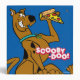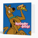 Découvrez Scooby-Doo assis avec un grand sourire, tenant une tranche de pizza farcie en croûte.