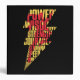 Découvrez les capacités de Shazam écrites en jaune, avec la silhouette de Shazam en rouge sur le devant, en forme de boulon éclair. Sagesse de Salomon, Force d'Hercule, Stamina d'Atlas, Puissance de Zeus, Courage d'Achille, Vitesse de Mercure.