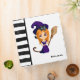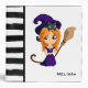 Un classeur avec une mignonne sorcière portant un grand casquette de sorcières violettes. Sa chatte noire se reposant sur le dessus de sa tête. Elle a de longs cheveux orange et porte un balai. Belle illustration de dessin animé parfaite pour l'halloween.