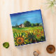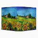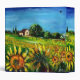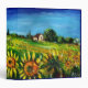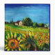 Paysage toscan, coloré, vibrant, beauté expressive de la flore d'été italienne et champs dans jaune vif orange, vert, marron, couleurs bleues, belles fleurs, cyprès et oliviers, ancienne ferme rustique sous le ciel bleu.Peinture acrylique sur toile.