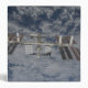 La Station Spatiale Internationale, sur fond de terre bleue et blanche.