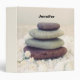 Un classeur avec une photo avec des piles de rochers les unes sur les autres. Entouré de rochers blancs et de petites fleurs blanches.