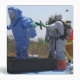 Un aviateur se tient dans une baignoire en solution de nettoyage pendant un processus de décontamination