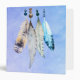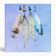 Un design aquarelle avec quatre plumes délicates et douces perlées ensemble accrochées à la bordure supérieure. L'arrière - plan est une douce texture d'aquarelle bleu violet. Un motif tribal avec un thème de style amérindien.