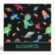 Watercolor Dinosaur Astronauts In Space Black. Tyrannosaurus Rex, Brontosaurus, Pterodactyl, and other dinosaurs in outer space. Kids fun dino space pattern. Personalize with name.