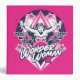 Cet art classique de personnage Wonder Woman est installé dans un graphique inspiré de la roche glam des années 80, avec des étoiles et des éclairs en rose vif et des couleurs marines profondes.