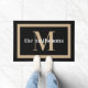 Simple and elegant custom doormat features your family name and monogram in classic lettering on a black background framed by a thick tan border.