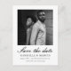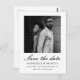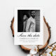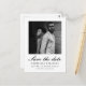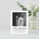 Simple and elegant black and white two photo wedding save the date announcement postcard features beautiful calligraphy script on the front with one photo, and a second arched shaped photo with wedding website details and return address on the back of the classic wedding announcement postcard. Shop this chic wedding collection for coordinating wedding invitations, and additional modern colour options.