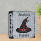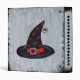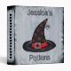 This binder has a spooky white painted look with a classic black Witch hat adorned with orange stars and a silver buckle with a cute spider dangling from the tip of the hat. The spine has a row of black stars. Customize the text to your own with the templates.