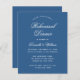 A classic blue rehearsal dinner invitation. It is simple, just white text on blue background. The words "Rehearsal Dinner" and the name are written in an elegant calligraphic script.