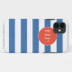 Dress up and protect your iphone with a classic blue cabana style striped pattern with a round circle design element that is custom monogrammed with your first, middle and last name initials in a stylish Sans Serif font. Classic blue, white and peppy orange colours.