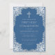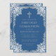 This elegant classic blue first communion invitation with a vintage air, recommended for a boy, has an ornate faux silver foil frame with faux silver leaves on a classic blue background. Above the text there is a religious cross in faux silver foil. All text can be personalized and has a light grey colour similar to the faux silver frame.