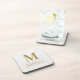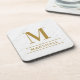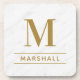 Classic and modern personalized beverage drink coaster design features an elegant custom serif monogram initial along with your family's last name accented with simple horizontal stripes against a white marble patterned background. Antique gold / brass text and design colours can be modified to perfectly coordinate with your home decor.