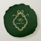 Beautiful and classic forest green Christmas holiday pillow features an elegant gold colour crest with bow design and your custom name with traditional calligraphy script.