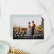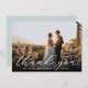 Elegant wedding thank you cards feature a single horizontal or landscape oriented photo with "Thank You" overlaid in chic white calligraphy script, Personalize with your names and wedding date along the bottom in classic block lettering. Add a personal message and signature to the back.