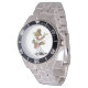 Has heft and feel of expensive stainless steel quartz watches. Good band with safety catch. I removed links, which is easy because engraved arrows show direction to push the linking pins. As always by this seller, the image (a railroad logo) is a perfect reproduction of my emailed image, and is precisely spaced and aligned.