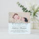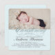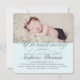 This sweet Christening Invitation features romantic cursive text, baby blue colours, and a damask design for a touch of elegance.