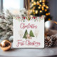 This beautiful Baby's First Christmas holiday ornament features a classic design with a sweet little bunny in front of decorated Christmas trees and accented with a red and green floral. Baby's First Christmas is written in modern calligraphy and includes the year. Personalize with your child's name and year. Design is the same on front and back of ornament. Perfect for your new little one!